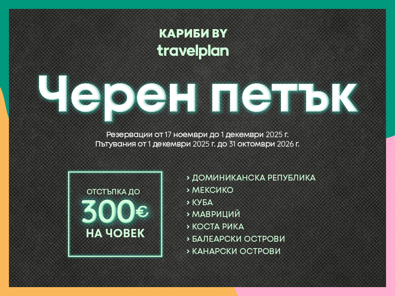 София. Туроператорът Travelplan стартира специална кампания за Черен петък, предлагаща отстъпки до 300 евро (до 586,75 лв.) на човек за едни от най-предпочитаните дестинации в света, съобщи за Bgtourism.bg Полина Цолова – търговски представител на Ávoris за България. Промоционалните предложения обхващат пътувания до Доминиканска република, Мексико, Куба, Мавриций, Коста Рика, както и до популярните Балеарски и Канарски острови.