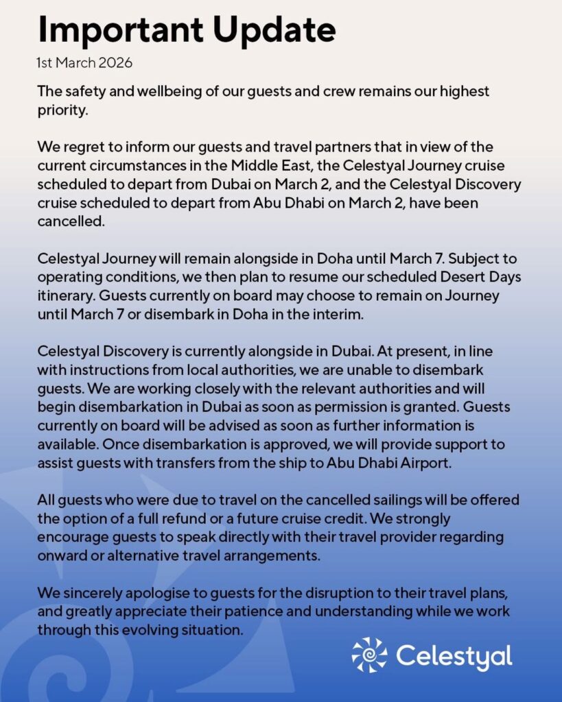 Круизната компания Celestyal съобщи, че поради настоящата ситуация в Близкия изток отменя планираните за 2 март отплавания на корабите Celestyal Journey от Дубай и Celestyal Discovery от Абу Даби.