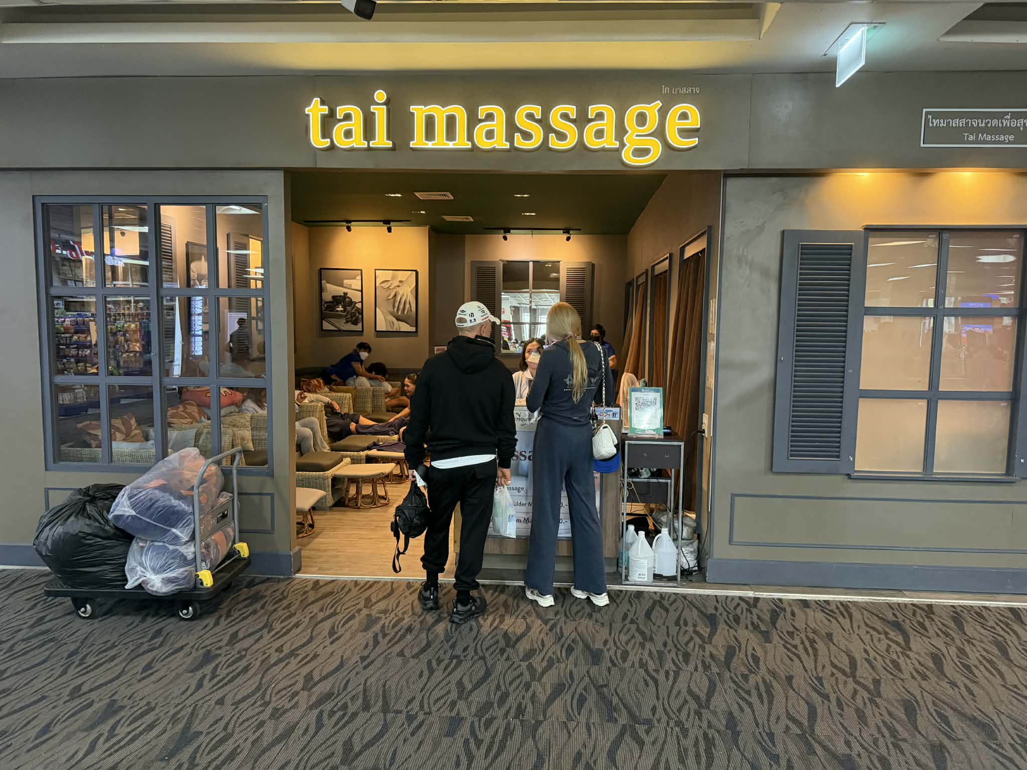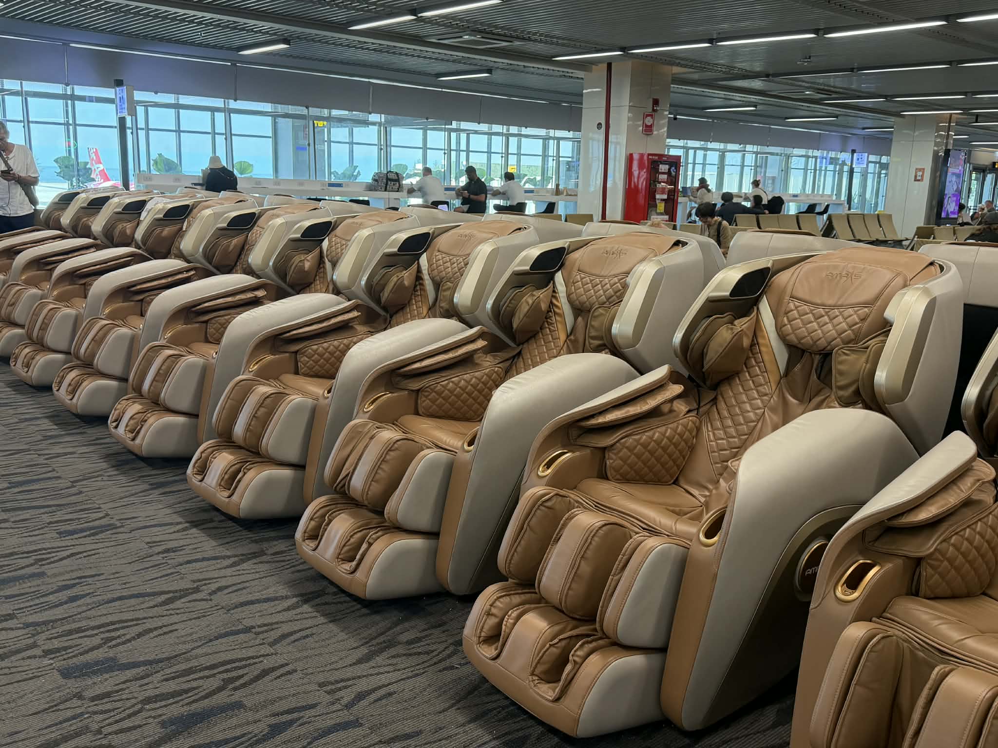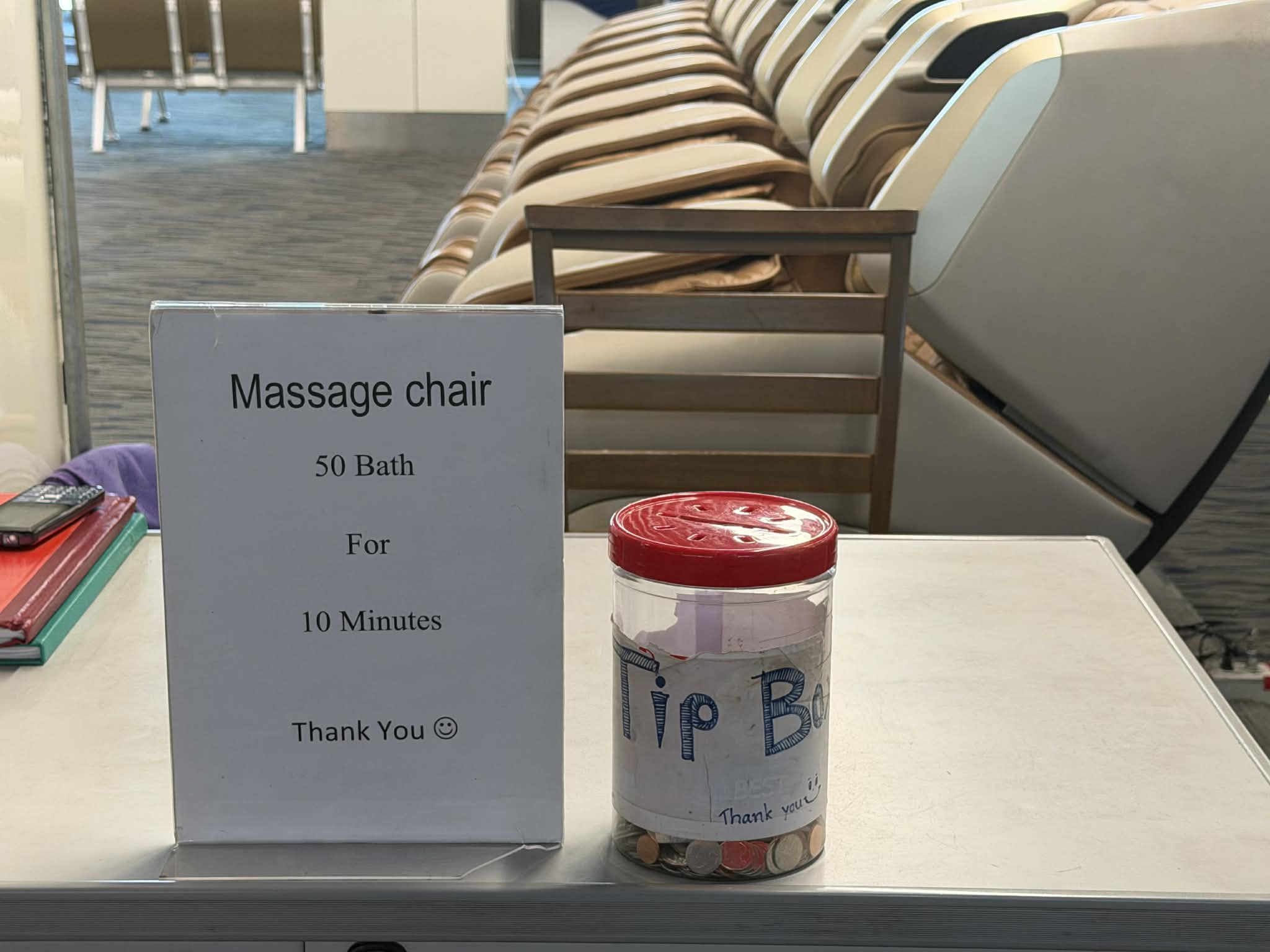 След като се чекират за полета, изпратят куфарите си по лентата и направят последни покупки от безмитните магазини, част от туристите избират да отделят няколко минути за кратък релакс. Масажната зона е разположена в сектора за заминаващи или може да се отбележи, че това е място, където уморените пътешественици могат да се отпуснат непосредствено преди полета си, видя екип на Bgtourism.bg, който посети Тайланд с програмата на “Емералд Травел”.