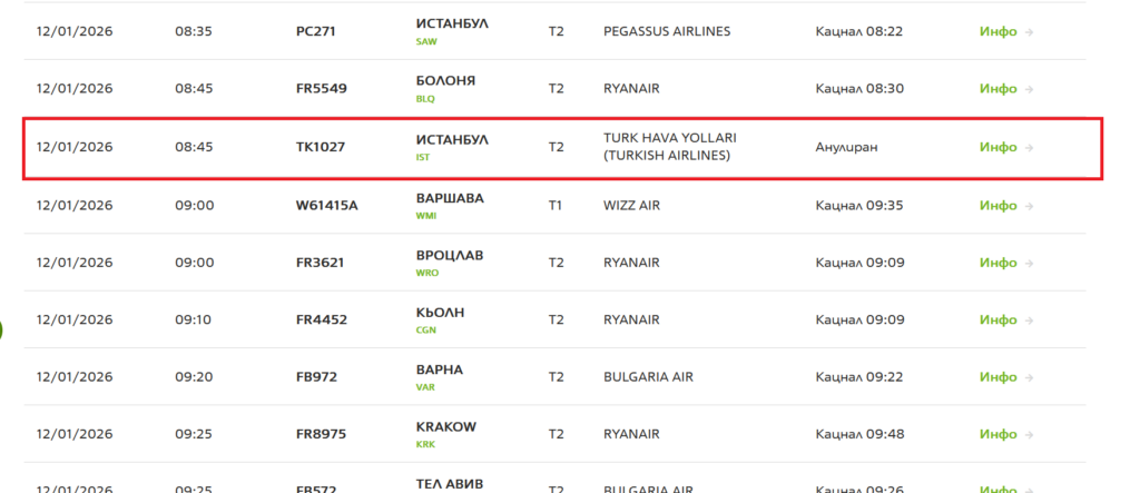 Истанбул. Заради неблагоприятните метеорологични условия в Истанбул в понеделник ще бъдат наложени ограничения върху полетите съгласно с решение на Комитета за метеорологични извънредни ситуации. Отменени са 54 полета на „Търкиш еърлайнс“ само на летище Истанбул, съобщи кореспондентът на БТА в Истанбул Нахиде Дениз, позовавайки се на информираха от пресцентъра на летището. Проверка на Bgtourism.bg в сайта на летище “Васил Левски” – София показа, че полетът на Turkish Airlines, който трябваше да кацне в 9:35 ч., е отменен. Излитането на заминаващия полет от столицата ни към турския мегаполис също е отложено.