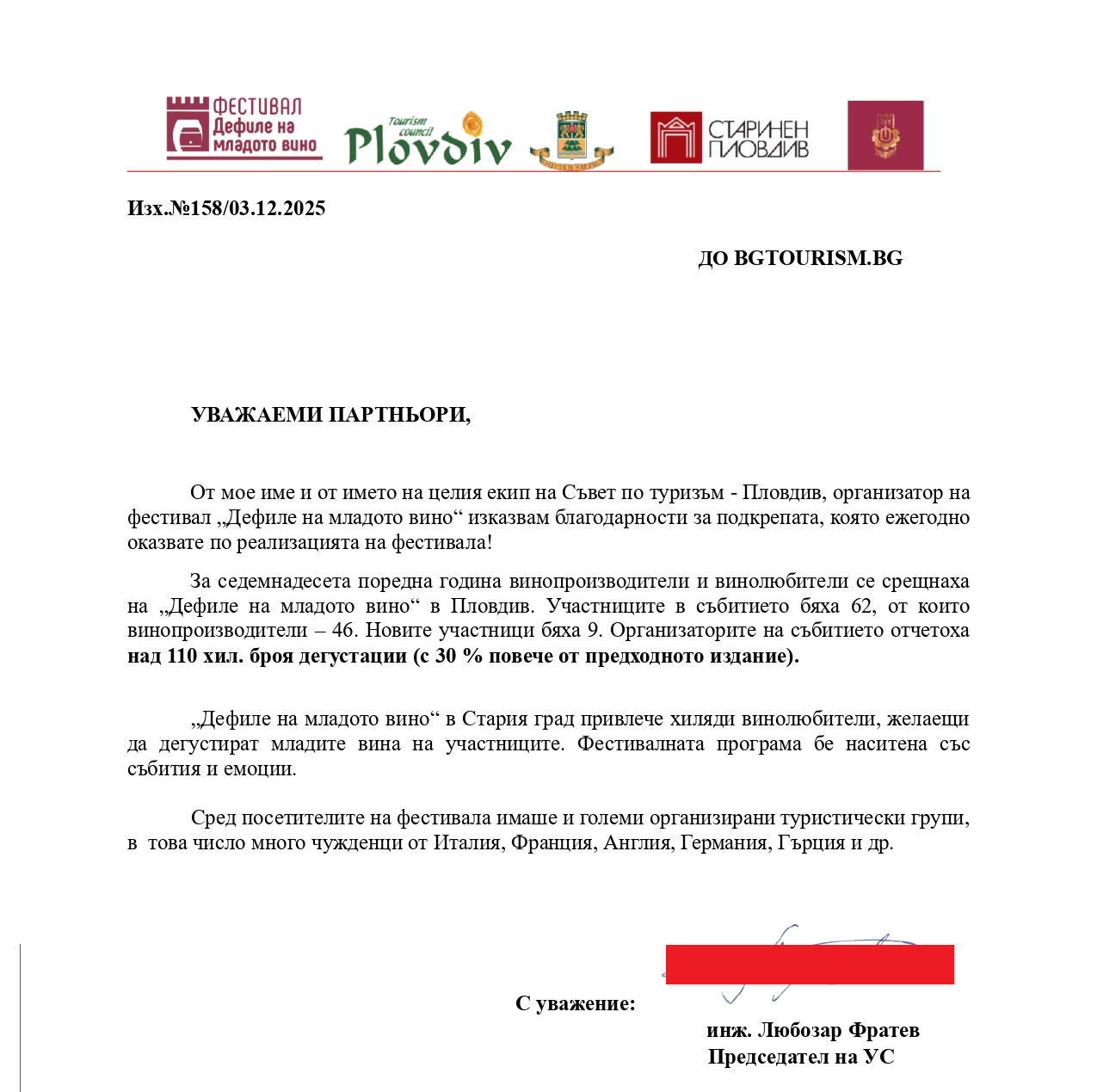 Това се казва в благодарствено писмо до Национална информационна агенция Bgtourism.bg от инж. Любозар Фратев – председател на УС. Той посочва, че проявата в Стария град е привлякла хиляди винолюбители, желаещи да дегустират младите вина на участниците, а фестивалната програма е била наситена със събития и емоции. Сред посетителите на фестивала е имало и големи организирани туристически групи, в това число много чужденци от Италия, Франция, Англия, Германия, Гърция и др.