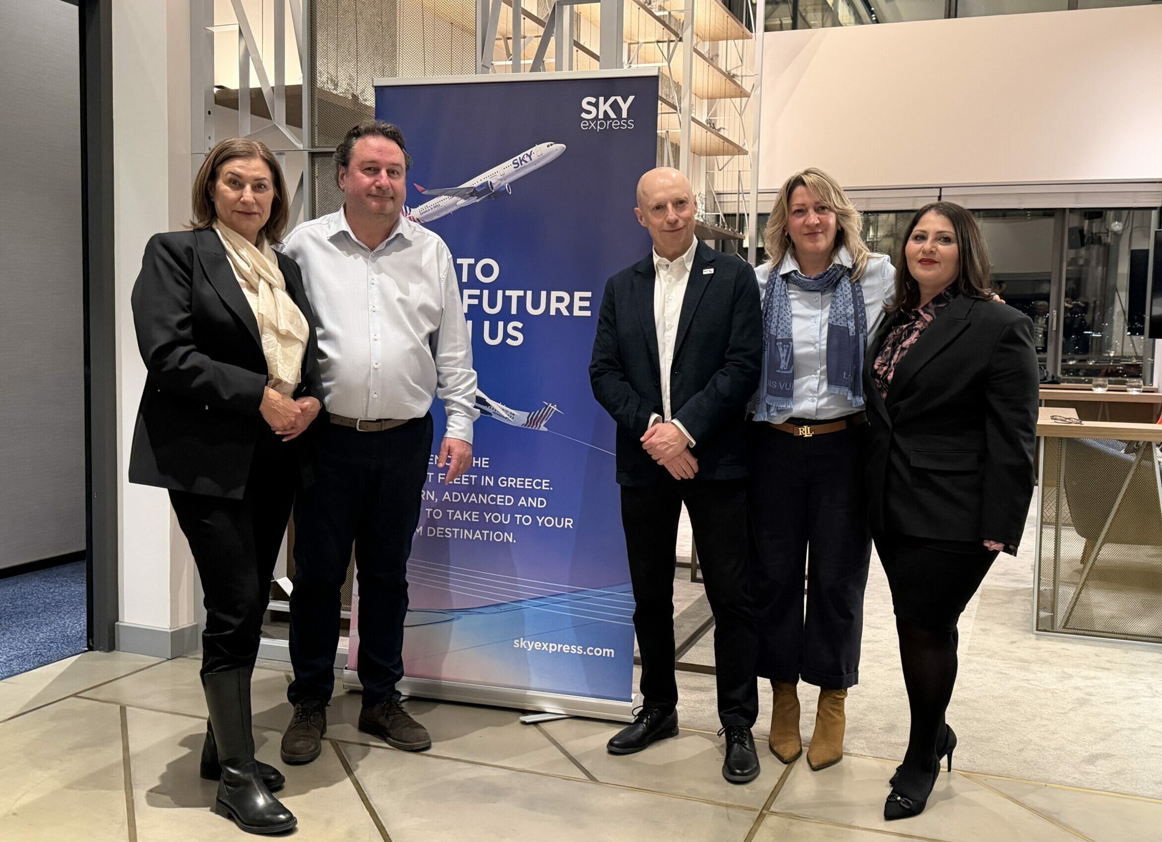 Той посочи, че SKY express е член на GR Group – водеща група в туризма и авиацията в Гърция, и има една от най-новите флотилии в Европа. Компанията обслужва най-голямата вътрешна мрежа в Гърция с 33 дестинации и динамично разширява международната си мрежа, която вече включва 27 европейски дестинации, с планове за допълнителни честоти и нови маршрути. Сред последните нови връзки са полетите от Атина до Берлин, Хамбург, Лисабон, Мадрид, Тел Авив и Лион, както и от Солун до Дюселдорф.